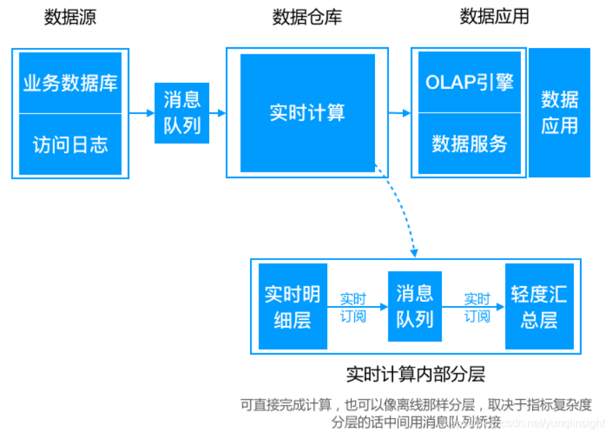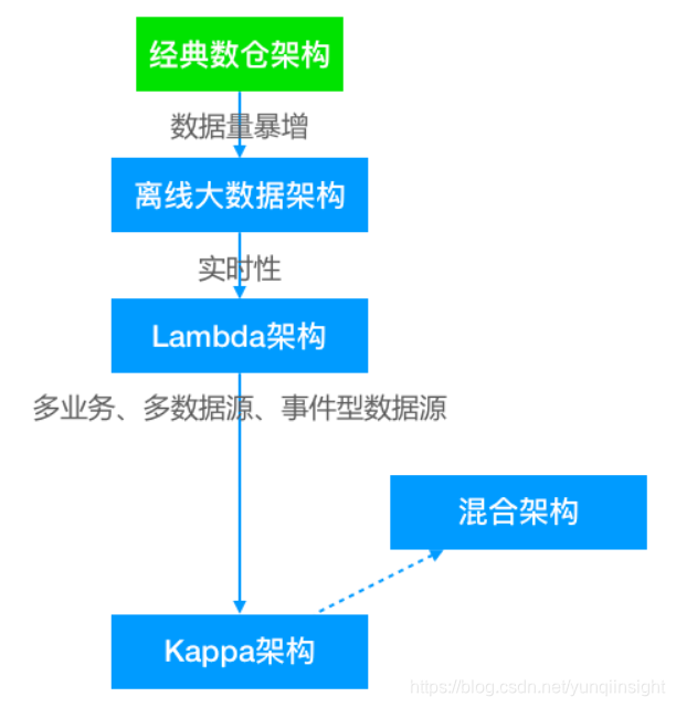 随着大数据应用的发展,人们逐渐对系统的实时性提出了要求,为了计算一些实时指标,就在原来离线数仓的基础上增加了一个实时计算的链路,并对数据源做流式改造(即把数据发送到消息队列),实时计算去订阅消息队列,直接完成指标增量的计算,推送到下游的数据服务中去,由数据服务层完成离线&实时结果的合并。