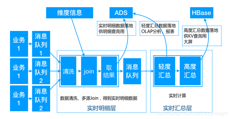 实时计算订阅业务数据消息队列,然后通过数据清洗、多数据源join、流式数据与离线维度信息等的组合,将一些相同粒度的业务系统、维表中的维度属性全部关联到一起,增加数据易用性和复用性,得到最终的实时明细数据。这部分数据有两个分支,一部分直接落地到ADS,供实时明细查询使用,一部分再发送到消息队列中,供下层计算使用;