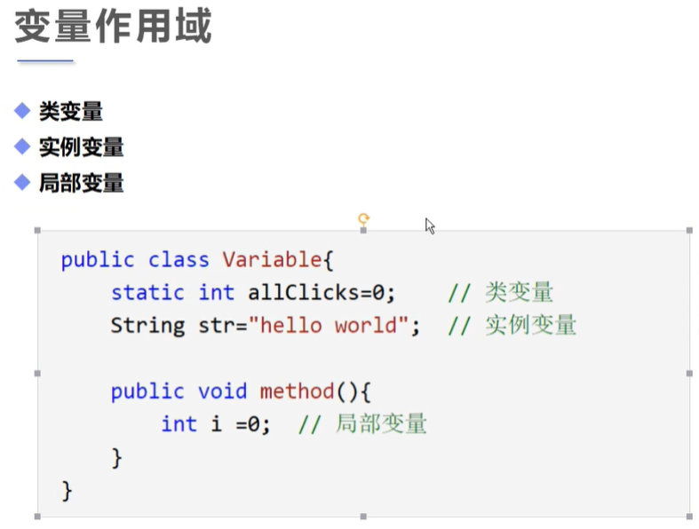 public class Demo06 {// 类变量 staticstatic double salary = 888;// 实例变量: 从属于对象; 如果不自行初始化,这个类型的默认值是 0 0.0// 布尔值 : 默认是false// 除了基本类型,其余都是nullString name;int age;public static void main(String[] args) {// 局部变量; 必须声明和初始化值int i = 10;System.out.println(i);Demo06 demo06 = new Demo06();System.out.println(demo06.age); // 0System.out.println(demo06.name); // nullSystem.out.println(salary); // 888.0}