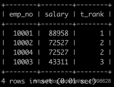 SELECT emp_no,salary, dense_rank() over(order by salary desc) as t_rank