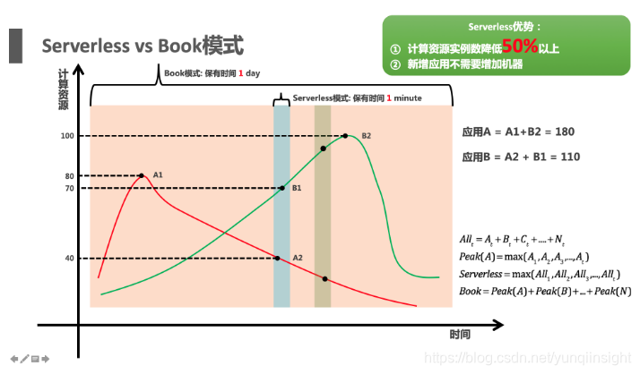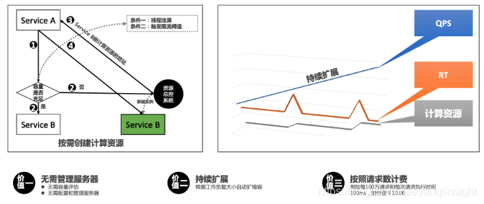- 价值二:持续扩展;之前的做法是每个应用程序独占一定数量的资源,如果变成Serverless 模式,所有应用程序可以共享资源池,每个应用程序几乎可以无限扩展。