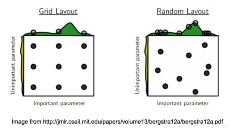 在网格布局中,很容易注意到,即使已经训练了9个模型,而每个变量只使用了3个值。然而,使用随机搜索,我们不太可能不止一次地选择相同的变量,将使用9个不同的值为每个变量训练9个模型。更多详细分析,请参阅该文。