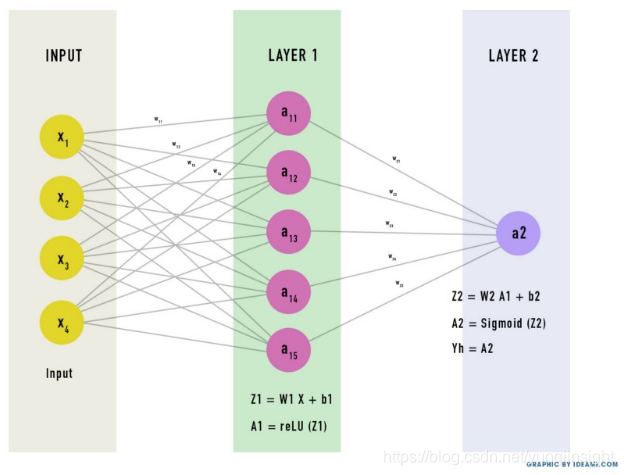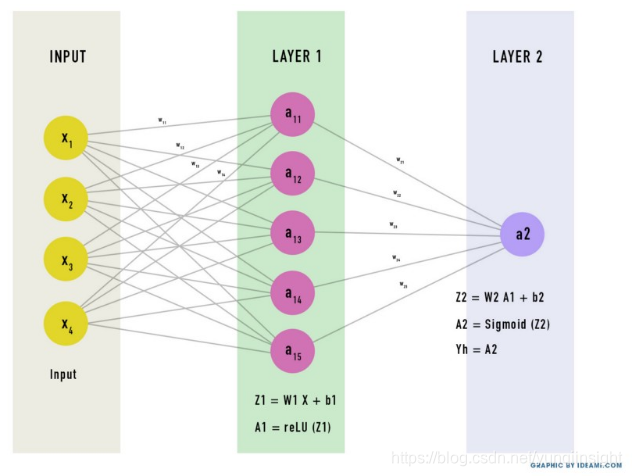Yh = A2 = Sigmoid(W2*ReLU (W1*X+ b1) + b2 )