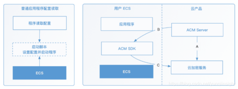 但是有一种场景,一般意义上的配置中心也是满足不了的,那就是诸如数据库密码这一类安全性要求很高的配置。这类在云上会有一些很好的实现,以上图右边为例解释一下在云上是如何做到的: