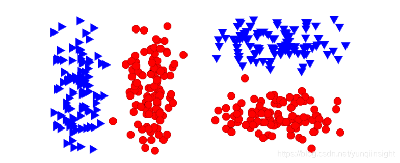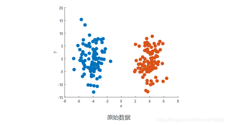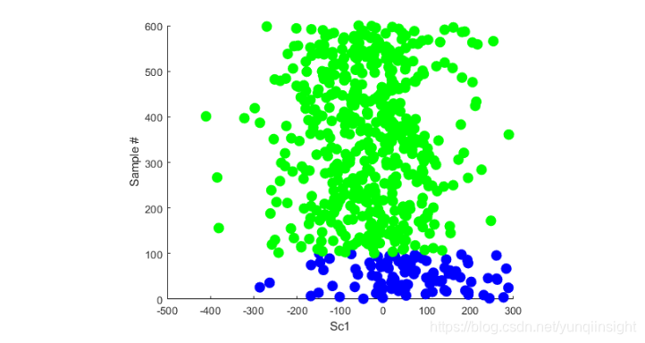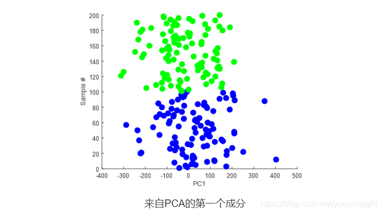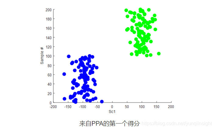 PCA失败在哪了呢?像上面描述的那样,PCA通过在数据中找到最大方差的方向来进行操作。那么如果投射到那个方向上没有效果呢?下图是由200个样本的模拟数据组成的,这些数据形成了两个分离的集群,它们沿着Y轴的方差大于沿着X轴的方差。如果我们对这个二维数据进行PCA操作,那么会得到投影向量v,它将是2×1的列向量([0;1])。投射到这个向量上的原始数据X(200x2)给出了我们的得分T=Xv。在把这些得分可视化之后表明了两个集群之间没有明显的分离。相反,如果我们投射到x轴上(v=[1;0]),那么很容易地就会看到这两个集群中的分离状态。那么我们如何在高维的数据中找到这个向量呢?