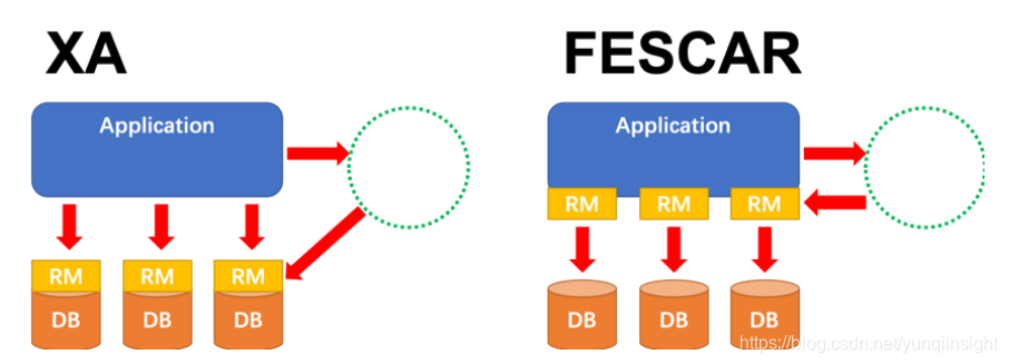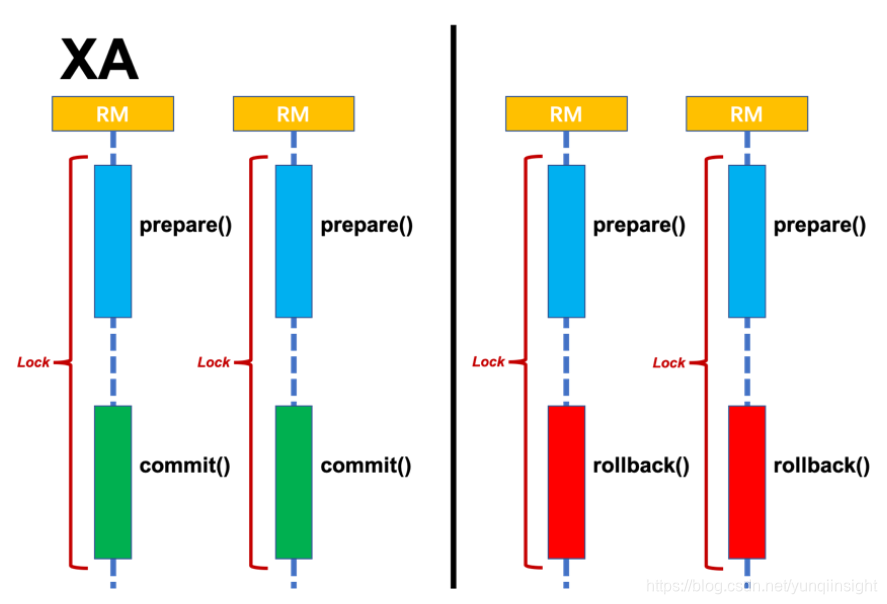 XA方案的 RM 实际上是在数据库层,RM本质上就是数据库自身(通过提供支持 XA 的驱动程序来供应用使用)。