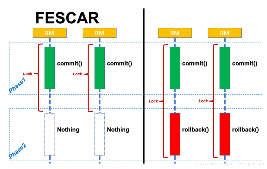 无论 Phase2 的决议是commit 还是 rollback,事务性资源的锁都要保持到Phase2 完成才释放。