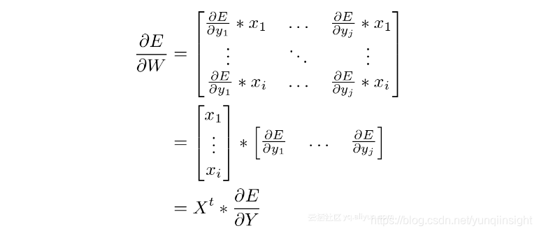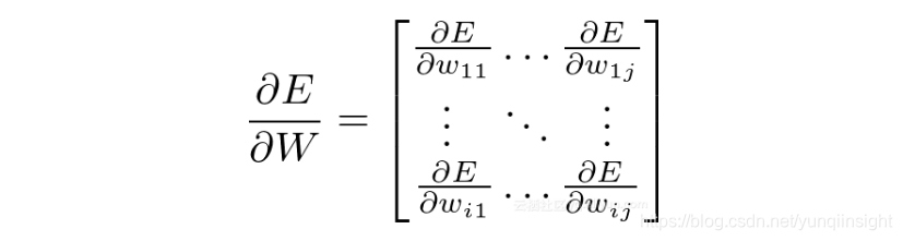 首先计算∂E/∂W,该矩阵应与W本身的大小相同:对于ixj,其中i是输入神经元的数量,j是输出神经元的数量。每个权重都需要一个梯度: