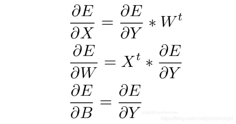 它背后的数学实际上并不复杂!这是一篇很好的文章,你可以找到∂E/∂W,∂E/∂B和∂E/∂X的解释和计算。