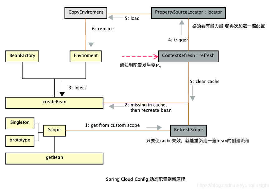 - Bean中的引用配置值需要重新注入一遍。重新注入的流程是在Bean初始化时做的操作,那也就是需要将refresh scope中的Bean 缓存失效,当再次从refresh scope中获取这个Bean时,发现取不到,就会重新触发一次Bean的初始化过程。