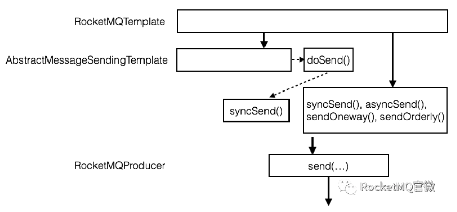 为了与Spring Messaging的发送模板兼容,在RocketMQTemplate集成了AbstractMessageSendingTemplate抽象类,来支持相关的消息转换和发送方法,这些方法最终会代理给doSend()方法;doSend()以及RocoketMQ所特有的一些方法如异步,单向和顺序等方法直接添加到RoketMQTempalte中,这些方法直接代理调用到RocketMQ的Producer API来进行消息的发送。
