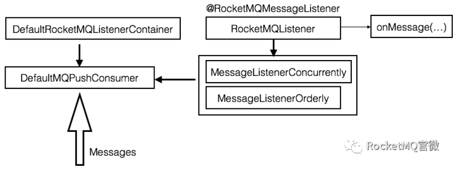 在消费端Spring-Boot应用启动后,会扫描所有包含@RocketMQMessageListener注解的类(这些类需要集成RocketMQListener接口,并实现onMessage()方法),这个Listener会一对一的被放置到DefaultRocketMQListenerContainer容器对象中,容器对象会根据消费的方式(并发或顺序),将RocketMQListener封装到具体的RocketMQ内部的并发或者顺序接口实现。在容器中创建RocketMQ Consumer对象,启动并监听定制的Topic消息,如果有消费消息,则回调到Listener的onMessage()方法。