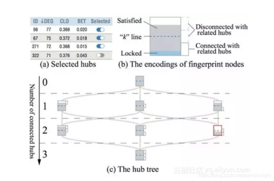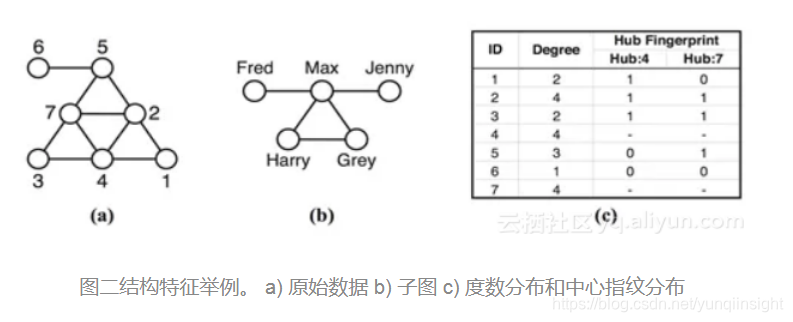 中心指纹:是指在最长路径`i`的限制下,图中普通节点和中心节点们之间的最短路径所形成的向量。这里为了简化复杂度,我们取`i`设为了`1`,即普通节点和中心节点们是否存在相邻关系作为节点的中心指纹(如图二中,图c中HubFingerprint为选取了原始图图a中4号节点和7号节点作为中心的的中心指纹分布);