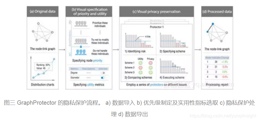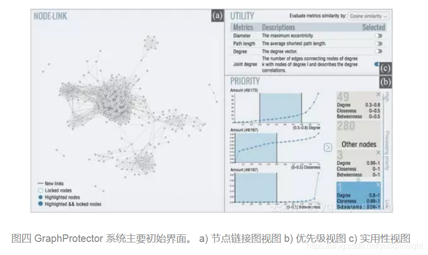 个人数据挖掘和个人隐私保护,并非鱼与熊掌,可视分析的技术手段能够帮助我们保护个人隐私数据,避免后续的数据挖掘暴露隐私的同时,平衡数据质量发生的变化,减少对后续数据挖掘的影响。针对网络数据中的隐私保护问题,浙江大学、加州大学戴维斯分校和阿里云DataV团队,共同发表了最新的研究成果《GraphProtector: a Visual Interface for Employing andAssessing Multiple Privacy Preserving Graph Algorithms》【1】,这项成果也已论文形式收录在IEEE TVCG中。