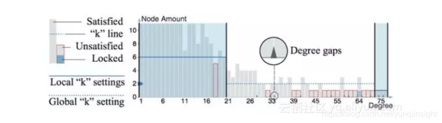 我们采用柱状图可视化了数据中的节点度数分布,横轴编码度数,按照从小到大的顺序排列,此外,在横轴上,我们还设计了一个“度数跳跃”符来编码度数分布之间的跳跃情况。纵轴编码该度数等价类中的节点个数,蓝色和灰色矩形分别编码锁定和未锁定的节点个数。