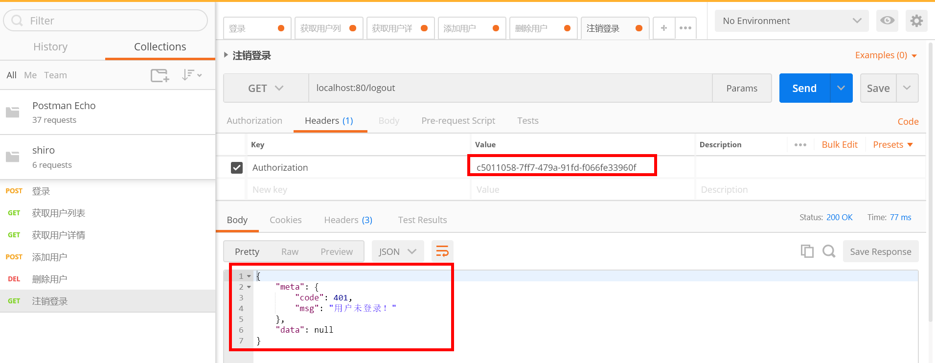 | 退出登入 查询redis中数据是否清除缓存信息 | GET | localhost:80/logout | Authorization |
