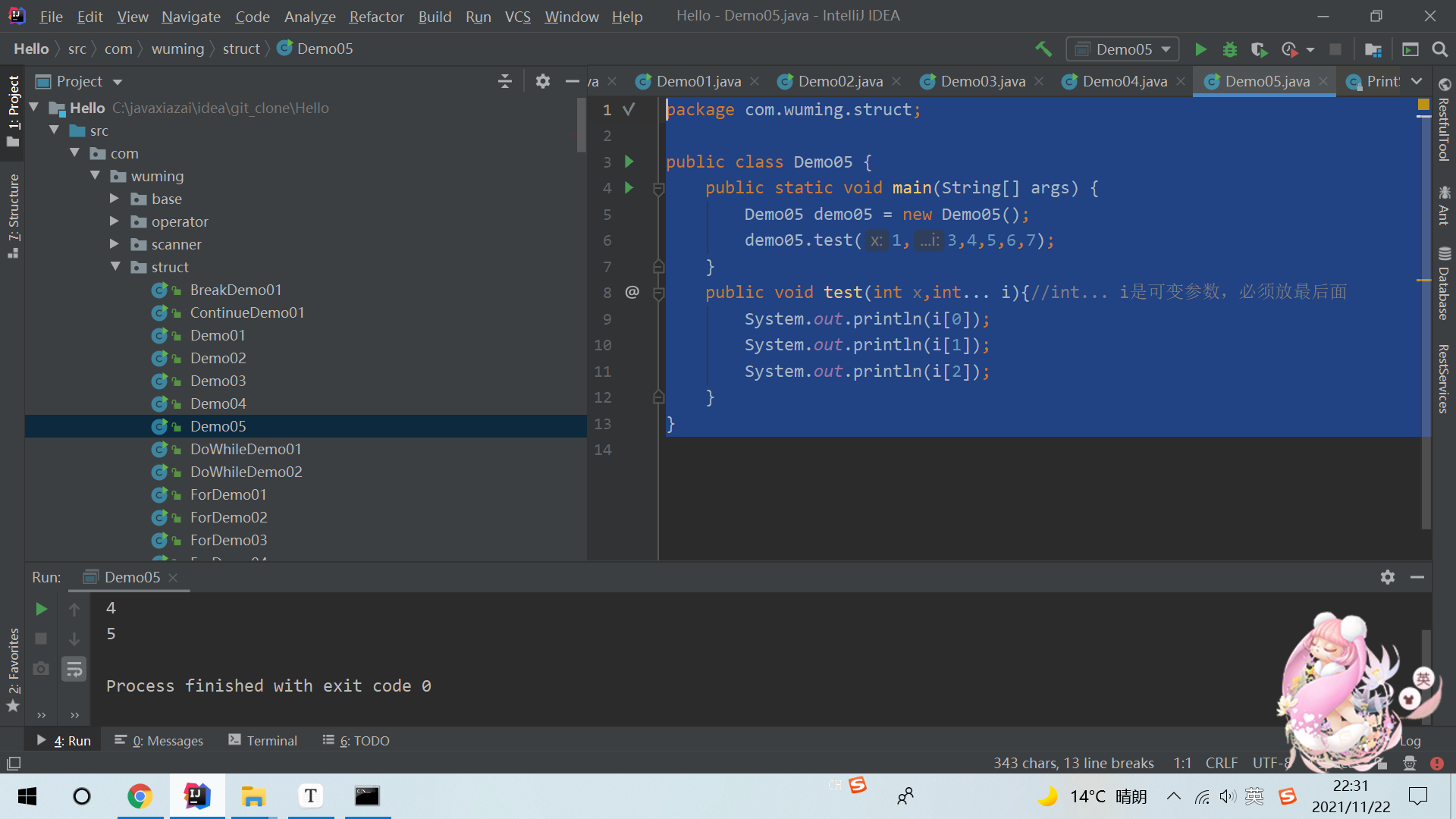 package com.wuming.struct;public class Demo05 {public static void main(String[] args) {Demo05 demo05 = new Demo05();demo05.test(1,3,4,5,6,7);}public void test(int x,int... i){//int... i是可变参数,必须放最后面System.out.println(i[0]);System.out.println(i[1]);System.out.println(i[2]);}