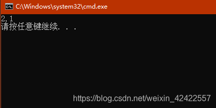 {int i = 1;printf("%d,%d\n",i++,i++);return 0;