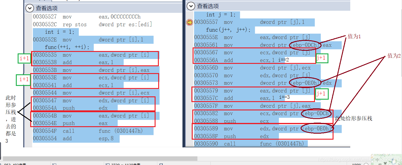 printf函数计算参数的时候是从右往左压栈的。目的是为了计算参数的个数。编译器首先从右往左计算各参数的值,再进行压栈操作,最右端的"++i"的值是计算出来是2,保存在eax寄存器中,接着计算倒数第二个"++i"的值,给eax寄存器加一,保存为3,然后进行压栈,把eax寄存器里的i的地址放入栈中,此时输出的值是i的值,所以都是3.