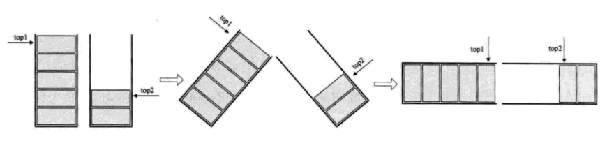 数组有两个端点,分别为两个栈的栈底,一个栈的栈底的位置为数组为0的地方,另一个栈的栈底为数组下标为SIZE-1的位置,SIZE为数组的长度。两个栈如果增加元素,就是两端点向中间延伸。