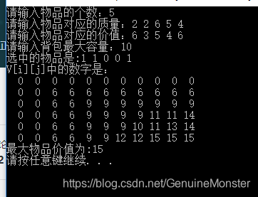 {int i,j;//循环变量//V[0][0] = 0;for (i=1;i<=n;i++)//当j=0时(j代表背包容量),0容量什么都装不进去,所以V[i][j]=0;V[i][0]=0;for (j=1;j<=capacity;j++)//当i=0时,代表没有物品,即使背包容量再大,其V[0][j]=0;V[0][j]=0;//#####下面进行判断######for (i=1;i<=n;i++)//i代表物品,j代表背包容量{//j代表背包的容量,将其从0逐步增加到输入的背包容量,相当于以背包的容量为限制,一步一步求得最大价值的方法。for (j=1;j<=capacity;j++){if(j<weight[i])//表示该物品?不能装入背包。V[i][j]=V[i-1][j];//表明此处的价值等于前i-1个物品装入的价值。else//第?个物品的重量小于背包的容量后就会有两种情况,一种放入,一种不放入,求这两种情况中Value最大的。V[i][j]=max(V[i-1][j],V[i-1][j-weight[i]]+value[i]);//如果把第?个物品装入背包,则背包物品的价值等于第?−1个物品装入容量位?−weight[?]的背包中的价值加上第?个物品的价值value[?]//如果第?个物品没有装入背包,则背包中物品价值就等于把前?−1个物品装入容量为?的背包中所取得的价值。}}j=capacity;//为标记“哪件物品放入背包”做准备for(i=n;i>=1;i--)//标记选出的物品函数{if(V[i][j]>V[i-1][j]){state[i]=1;//1表示选中j=j-weight[i];}elsestate[i]=0;//0表示未选中}printf("选中的物品是:");for(i=1;i<=n;i++)printf("%d ",state[i]);printf("\n");cout<<"V[i][j]中的数字是:\n";for(int i=0;i<=n;i++){for(int j=0; j<=capacity;j++){printf("%3d", V[i][j]);if (j == capacity){printf("\n");}}}return V[n][capacity];