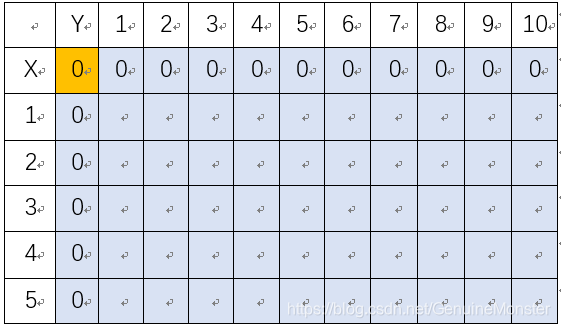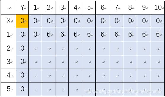 A、当只有0种物品时,无论背包的容量是多少,背包内物品的总价值都为0(因为没有东西可放);当物品的种类很多时,但是背包的容量为0,背包内物品的总价值仍然为0(因为放不进去啊!)所以这个最佳价值表的第0行,第0列都是“0”,其中V[0][0]=0,不是因为我在程序中按照上述赋值为0,其真实原因是:只要是宏变量,声明在头文件下的变量,其初值都会自动为0。上述内容相当于对这个最佳价值表做了一个初始化,如下图所示: