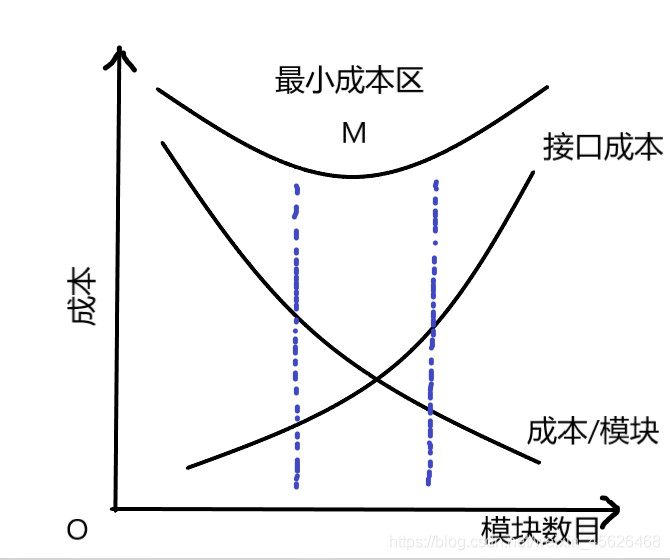 当模块数目增加时每个模块的规模将减小,开发单个模块需要的成本确实减少了,但是,随着模块数目的增加,设计模块间接口所需要的工作量也将增加,根据这两个因素,得出图中的总成本曲线。