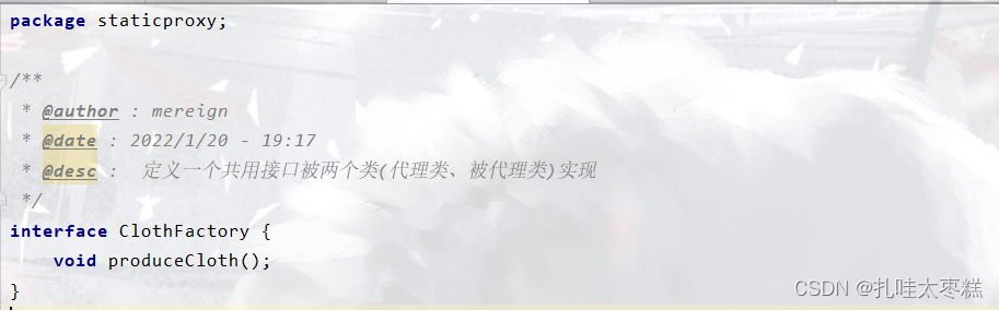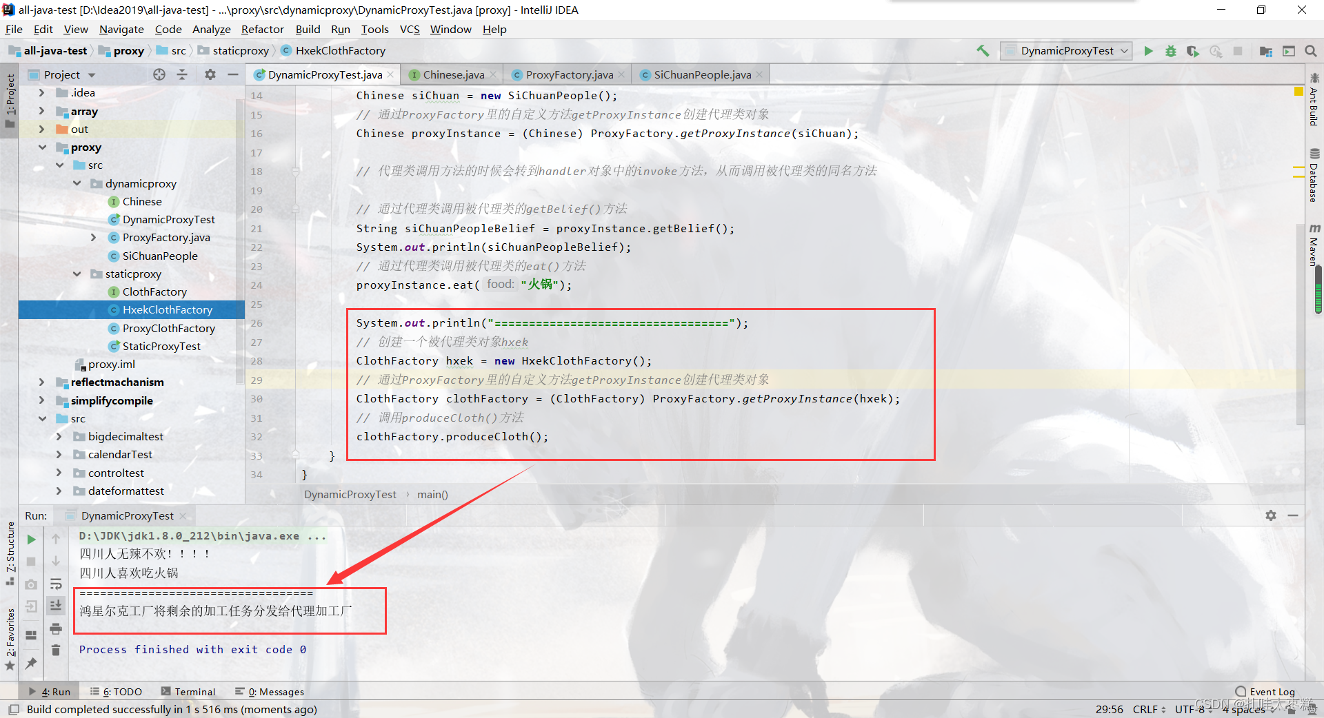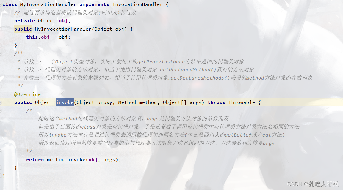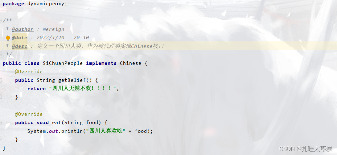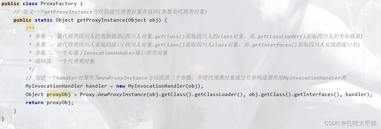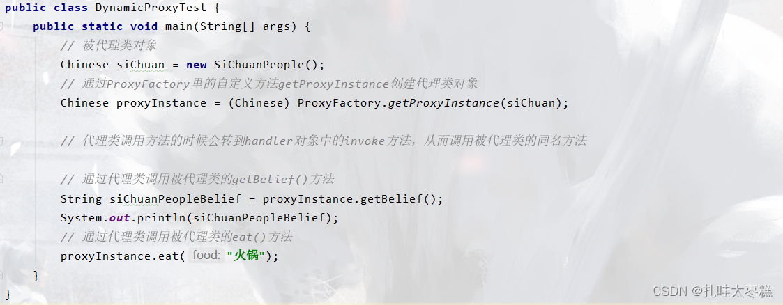 ⚠ 这个代理工厂不只可以代理被代理类siChuanPeople类,还可以代理上个静态代理案例中的被代理类HxekClothFactory类,因为使用了反射,所以代理工厂可以动态的创建所需要的代理类,而不需要用一个创一个