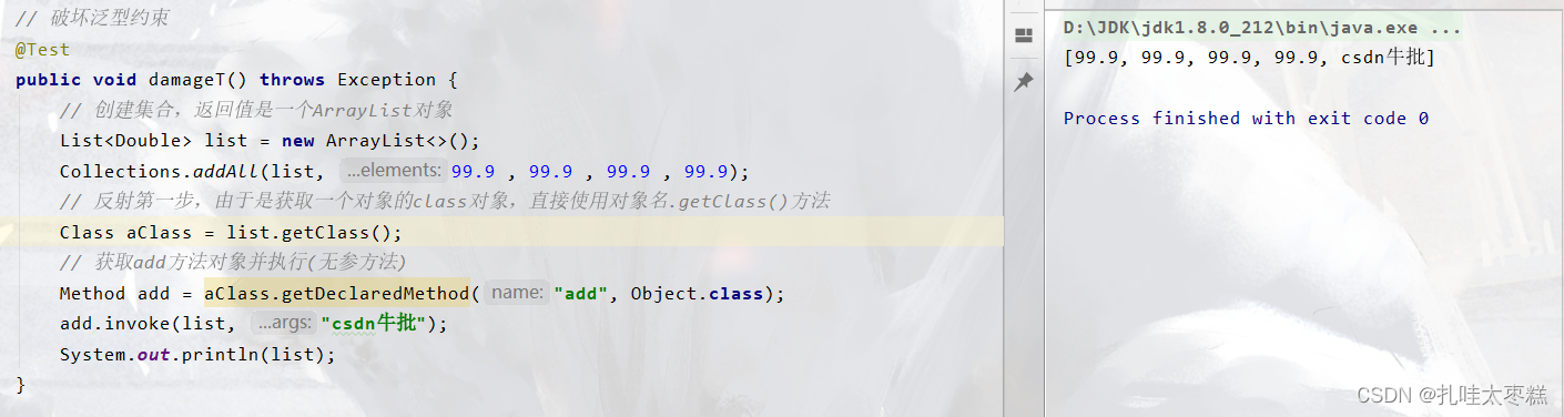 ⚠ 反射不仅可以破坏面向对象的封装性(暴力反射),还可以破坏泛型的约束性,具体原因是泛型是在编译阶段的约束,在编译完成运行时会被擦除泛型约束此时就可以无视泛型约束了,而反射就是在运行时改变操作对象结构的一种机制,于是可以使用反射来破坏泛型的约束性。