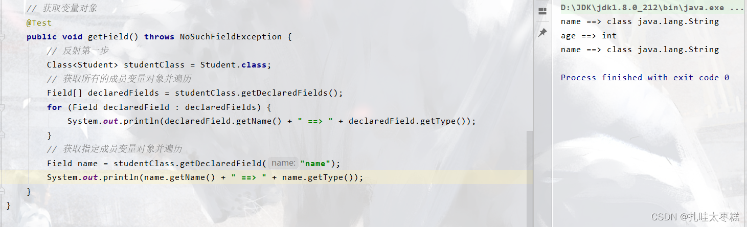 Java提供了一个类java.lang.Class,通过类名.class获取这个类编译之后的class文件对象,再通过这个class对象解析得到这个类的所有成分包括:构造器对象(Constructor)、成员变量对象(Field)、成员方法对象(Method)。