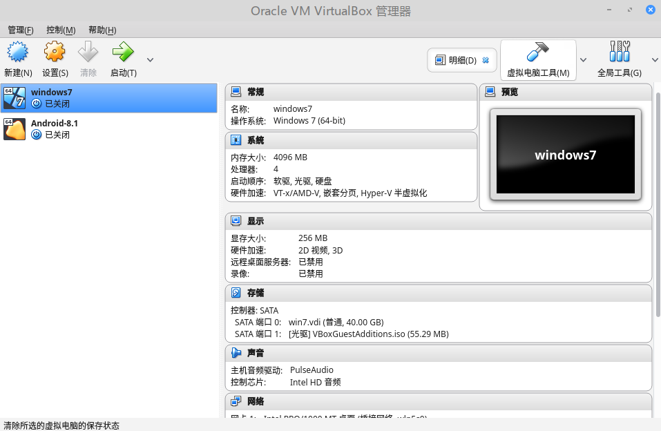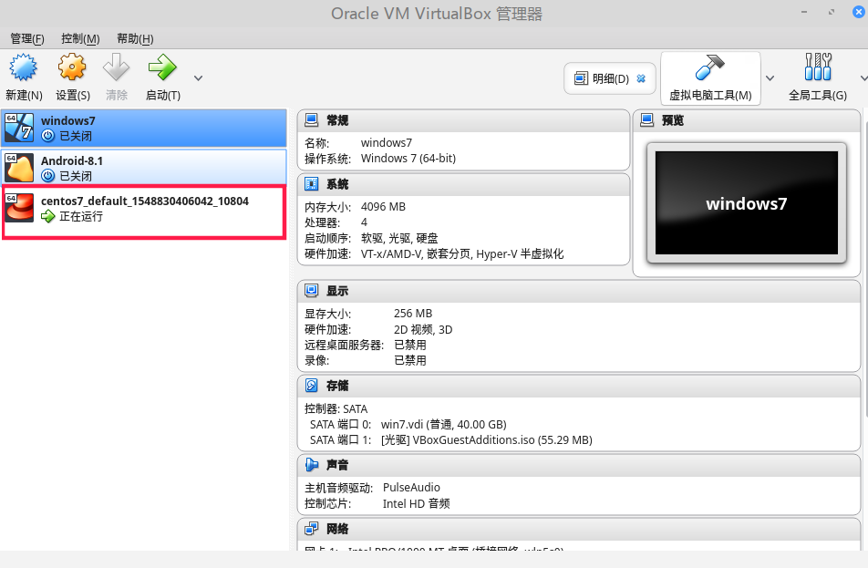 同时可以在 VirtualBox 管理器中可以看到 已经正在安装的虚拟机