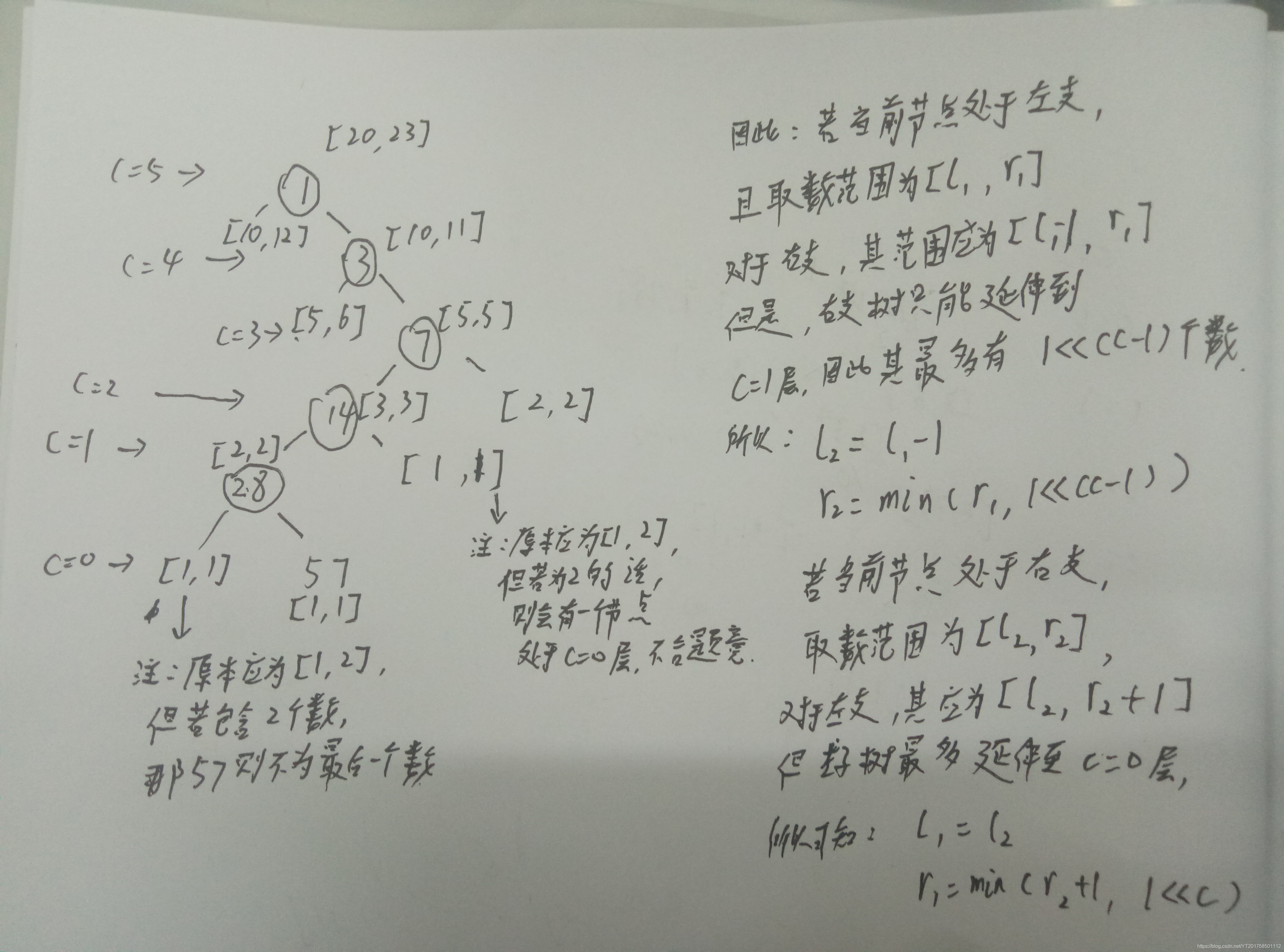 首先我们可以知道,对于节点x,在线段树中其左节点为x*2,右节点为x*2+1,并且左子数包含的点等于右子树包含的点数或者等于右子树包含的点数加一,所以对于每一个节点,用l代表此节点包含的最小能包含几个数,r代表此节点包含的最多能包含几个数,c代表当前节点的层数。