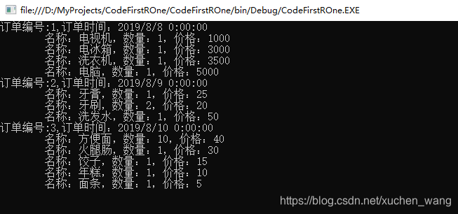 {using (kTStoreModel db = new kTStoreModel()){foreach (Order order in db.Order){Console.WriteLine("订单编号:{0},订单时间:{1}", order.Id, order.OrderDate);foreach (OrderDetail detail in order.OrderDetail){Console.WriteLine("\t名称:{0},数量:{1},价格:{2}",detail.ProductName,detail.Quantity,detail.Price);}}Console.ReadKey();}