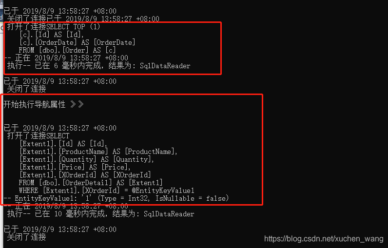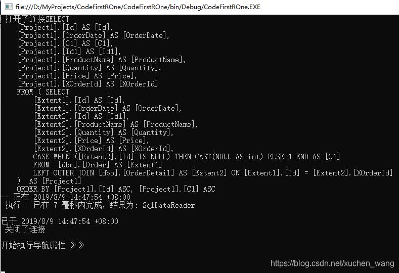 using (kTStoreModel db = new kTStoreModel()){db.Database.Log = Console.Write;Console.WriteLine("\n\n开始执行SQL》》\n\n");var cs = db.Order.Include("OrderDetail").Select(x => x).ToList();Console.WriteLine("\n\n开始执行导航属性 》》\n\n");var details = cs.First().OrderDetail;}Console.ReadKey();