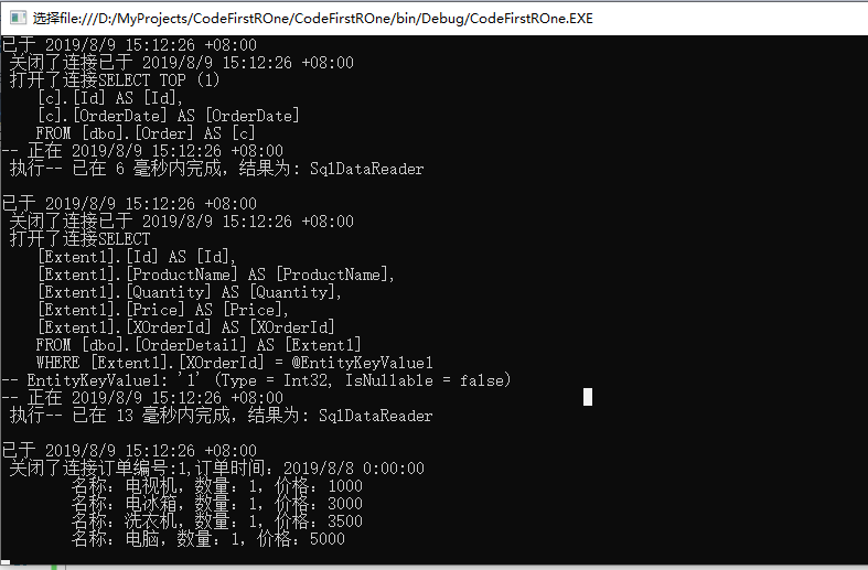 {db.Database.Log = Console.Write;Order order = db.Order.First();db.Entry(order).Collection(c => c.OrderDetail).Load();Console.WriteLine("订单编号:{0},订单时间:{1}", order.Id, order.OrderDate);foreach (OrderDetail detail in order.OrderDetail){Console.WriteLine("\t名称:{0},数量:{1},价格:{2}", detail.ProductName, detail.Quantity, detail.Price);}Console.ReadKey();