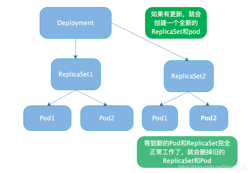 更新Deployment的时候,会自动创建ReplicaSet,并自动启动新的pod