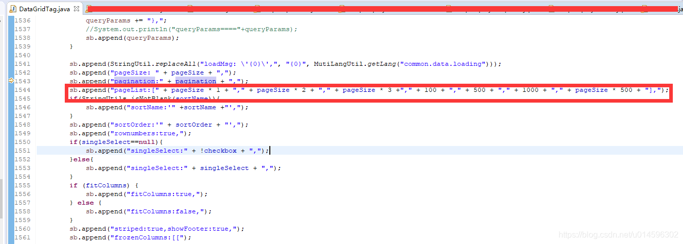 sb.append(StringUtil.replaceAll("loadMsg: \'{0}\',", "{0}", MutiLangUtil.getLang("common.data.loading")));sb.append("pageSize: " + pageSize + ",");sb.append("pagination:" + pagination + ",");sb.append("pageList:[" + pageSize * 1 + "," + pageSize * 2 + "," + pageSize * 3 +"," + 100 + "," + 500 + "," + 1000 + "," + pageSize * 500 + "],");if(StringUtils.isNotBlank(sortName)){sb.append("sortName:'" +sortName +"',");}sb.append("sortOrder:'" + sortOrder + "',");sb.append("rownumbers:true,");if(singleSelect==null){sb.append("singleSelect:" + !checkbox + ",");}else{sb.append("singleSelect:" + singleSelect + ",");}