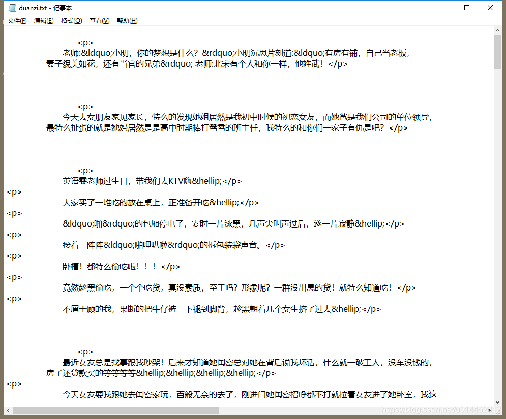 import reclass Spider:def __init__(self):self.page = 1self.switch = Truedef loadPage(self):print 'loadPage'url = "http://www.neihan8.com/article/list_5_" + str(self.page) + ".html"headers = {"User-Agent" : "Mozilla/5.0 (Windows NT 10.0; Win64; x64) AppleWebKit/537.36 (KHTML, like Gecko) Chrome/54.0.2840.99 Safari/537.36"}request = urllib2.Request(url, headers=headers)response = urllib2.urlopen(request)html = response.read()gbk_html = html.decode('gbk').encode('utf-8')pattern = re.compile('<div\sclass="f18 mb20">(.*?)</div>', re.S)content_list = pattern.findall(gbk_html)self.dealPage(content_list)def dealPage(self, content_list):for item in content_list:item = item.replace('<br />', '').replace('<p>', '').replace('</p>', '')self.writePage(item)def writePage(self, item):with open('duanzi.txt', 'a') as f:f.write(item)def startWork(self):while self.switch:self.loadPage()command = raw_input('please enter continue, q back')if command == 'q':self.switch = Falseself.page += 1print '3q use'if __name__ == '__main__':s = Spider()s.startWork()
