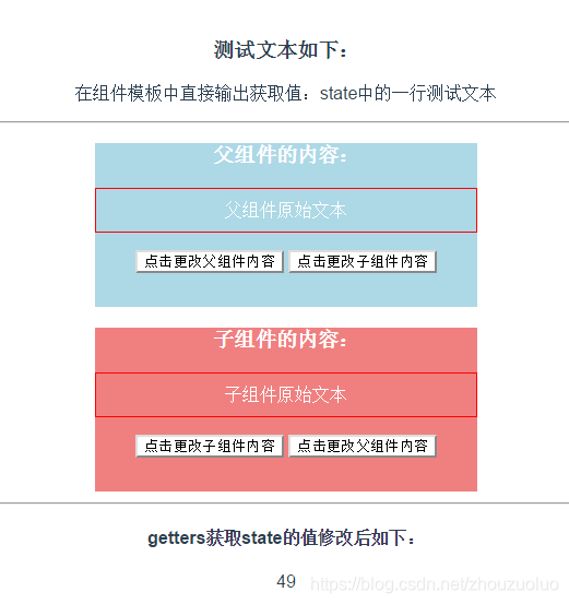 <script>import Child from './Child'export default {name:"Parent",data(){return {}},components:{Child,},computed:{oldtxt:function(){return this.$store.state.parentMsg;}},methods:{changeParentTxt:function(){let newParentTxt="更改后的父组件内容变长的很多!!!";this.$store.dispatch('changeParentTxt',newParentTxt);},changeChildTxt:function(){let newChildTxt="这里是父组件点击修改后的文本内容....";this.$store.dispatch('changeChildTxt',newChildTxt);},},}