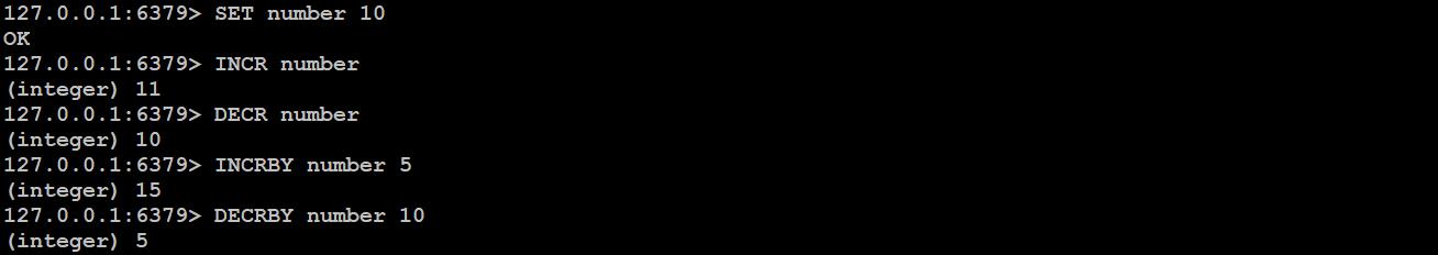 | INCRBY key increment | 加指定值 increment,Key 不存在的时候会设置 Key,并认为原来的 Value 为 0 |