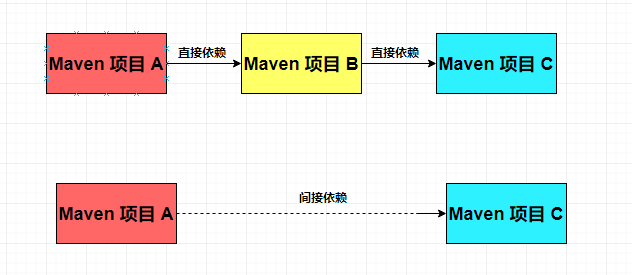 上图,如果 Maven 项目 B 已经依赖了 C ,A 又依赖了 B,那么 A 不需要再在自己的pom 中重复引入 C 的依赖声明,就可以直接使用 C 中的代码了。
