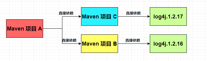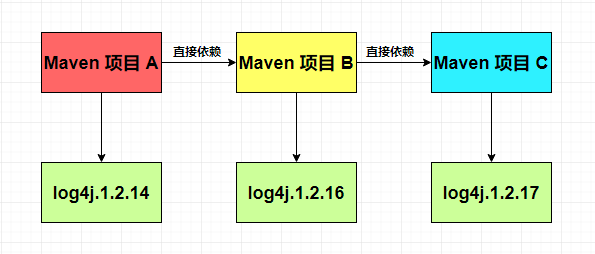 如上图中 ,在 A 的pom 中如果 先声明了 C ,那么,将会优先使用 log4j.1.2.17版本。