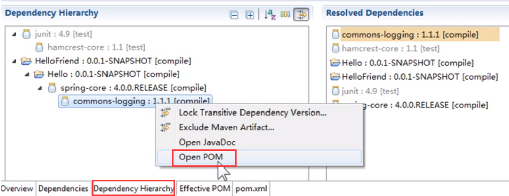设置方式是在希望排除某个依赖的工程中配置<exclusions>标签即可。需要填写groupId和artifactId两项,那么不管什么版本的依赖都会被直接排除掉。另外,可以在层级视图中打开pom: