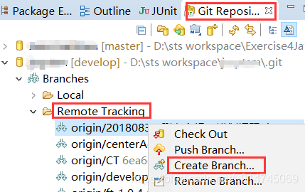 这样,EGit会自动在本地Git仓库中新建一个同名的分支,并自动将切换到这个分支上。这个同名的本地分支已经与远程库中的分支自动关联,我们push的代码都可以被合并到远程的这个分支上。