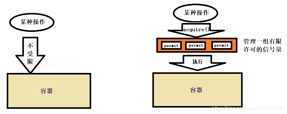 上图左边是普通的对容器的操作,右边是有了信号量的对容器的操作。可以看出,在增加了中间的信号量之后,对容器的操作将会受限。