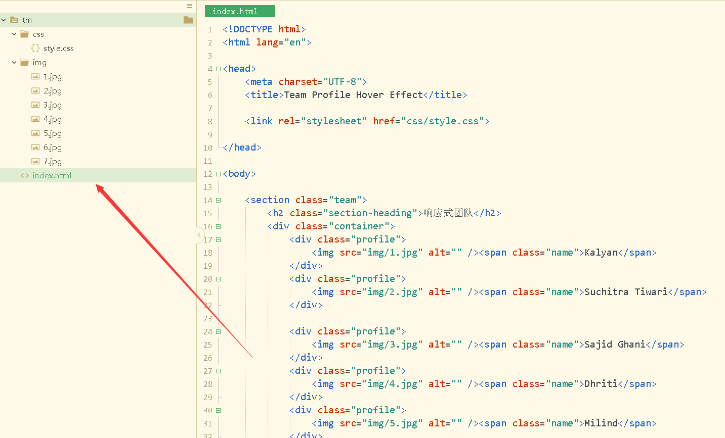 <html lang="en"><head><meta charset="UTF-8"><title>Team Profile Hover Effect</title><link rel="stylesheet" href="css/style.css"></head><body><section class="team"><h2 class="section-heading">响应式团队</h2><div class="container"><div class="profile"><img src="img/1.jpg" alt="" /><span class="name">Kalyan</span></div><div class="profile"><img src="img/2.jpg" alt="" /><span class="name">Suchitra Tiwari</span></div><div class="profile"><img src="img/3.jpg" alt="" /><span class="name">Sajid Ghani</span></div><div class="profile"><img src="img/4.jpg" alt="" /><span class="name">Dhriti</span></div><div class="profile"><img src="img/5.jpg" alt="" /><span class="name">Milind</span></div><div class="profile"><img src="img/6.jpg" alt="" /><span class="name">Srikant Tiwari</span></div><div class="profile"><img src="img/7.jpg" alt="" /><span class="name">Major Sameer</span></div></div></section></body></html>