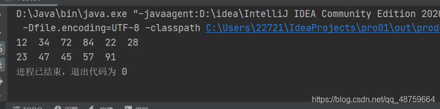 public class Test09 {public static void main(String[] args) {int[] arr = {12,34,23,47,72,84,22,28,45,57,91};//用于统计偶数元素个数int o = 0;for (int i = 0;i< arr.length;i++){if (arr[i]%2==0){o++;}}//分别定义奇偶数组int[] os = new int[o];int[] js = new int[arr.length-o];//分别统计奇偶数组中元素的个数int num1 = 0;int num2 = 0;for (int x:arr){if (x%2==0){os[num1] = x;num1++;}else {js[num2] = x;num2++;}}//遍历奇偶数组for (int i:os){System.out.print(i+"\t");}System.out.println();for (int i:js){System.out.print(i+"\t");}}