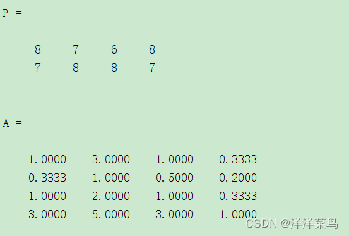 A=[1,3,1,1/3;1/3,1,1/2,1/5;1,2,1,1/3;3,5,3,1]P=[8,7,6,8;7,8,8,7] %每一行代表一个对象的指标评分