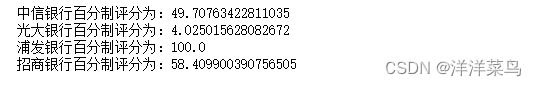 for i in range(0,len(Score)):print(f"{data['银行'][i]}银行百分制评分为:{Score[i]}")