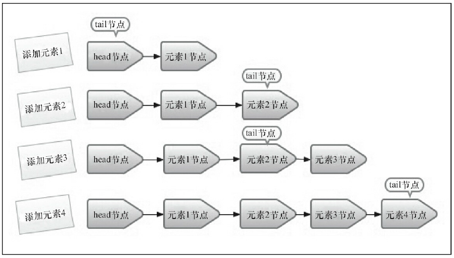 添加元素4:设置元素3的next节点为元素4节点,然后将tail节点指向元素4节点。